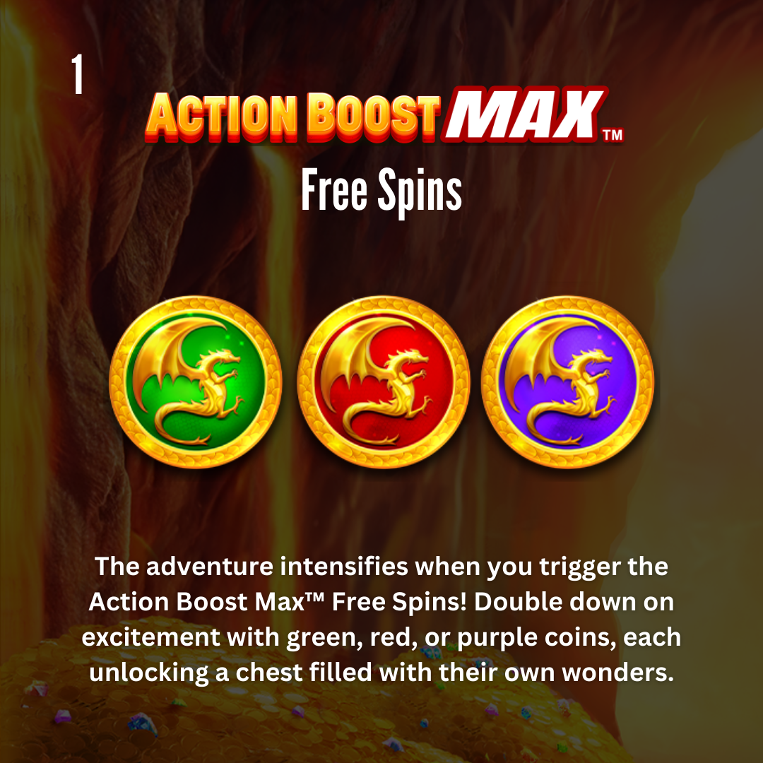 But why stop there? Ignite all three Action Boost Max™ Free Spins for a gaming spectacle packed with expanding reels, multipliers, instant credits, extra spins, and multiple jackpot opportunities. Rise to the challenge and potentially multiply your winnings up to 5000x! Step into this epic saga and unlock the full power of your fortune in Action Boost Max™ Dragon's Cache. Where every spin could turn into a treasure!